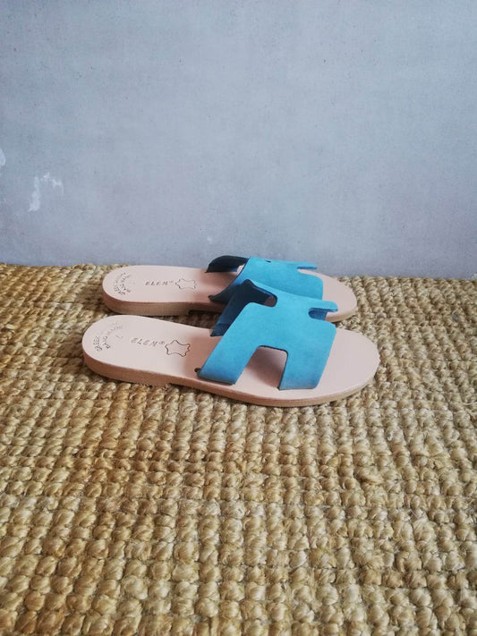 Οι μικρές βιοτεχνίες στην Κύπρο δυστυχώς έχουν σιγά σιγά εκλείψει, έτσι φέτος, στην πρώτη επίσημη εμφάνιση των σανδαλιών παρουσιάζω μια νέα συνεργασία. Το δέρμα που χρησιμοποιούμε είναι δέρμα κρητικής βακέτας λείας ή κερωμένης, με δέψη απο φυσικά υλικά. Αυτό είναι το πιο ανθεκτικό δέρμα, καθώς διατηρεί όλα τα χαρακτηριστικά του: υφή, σημάδια αρχικού δέρματος, μαλακότερη αίσθηση με το πέρασμα του χρόνου. Να θυμάστε πως το μπεζ δέρμα σκουραίνει όταν εκτεθεί στο φως, και αυτό δηλώνει την αυθεντικότητα και την ανθεκτικότητα του υλικού. Σε δέρμα nubuck (βλ.τιρκουάζ παντόφλα και κάποιες τσάντες), φτιάχνεται από την εξωτερική πλευρά του δέρματος, με διαδικασία τράχυνσης προκειμένου να δώσει την αίσθηση βελούδινης υφής.