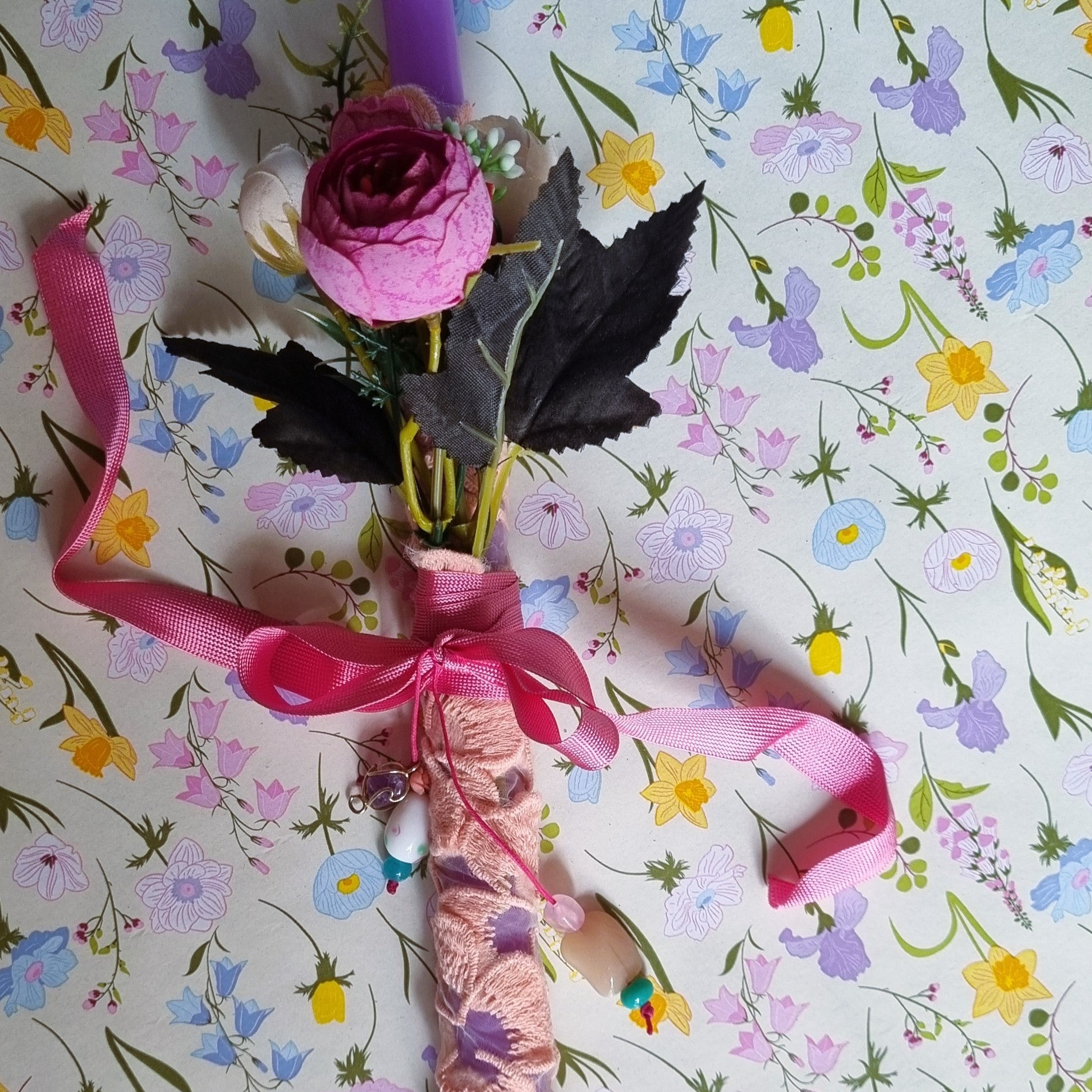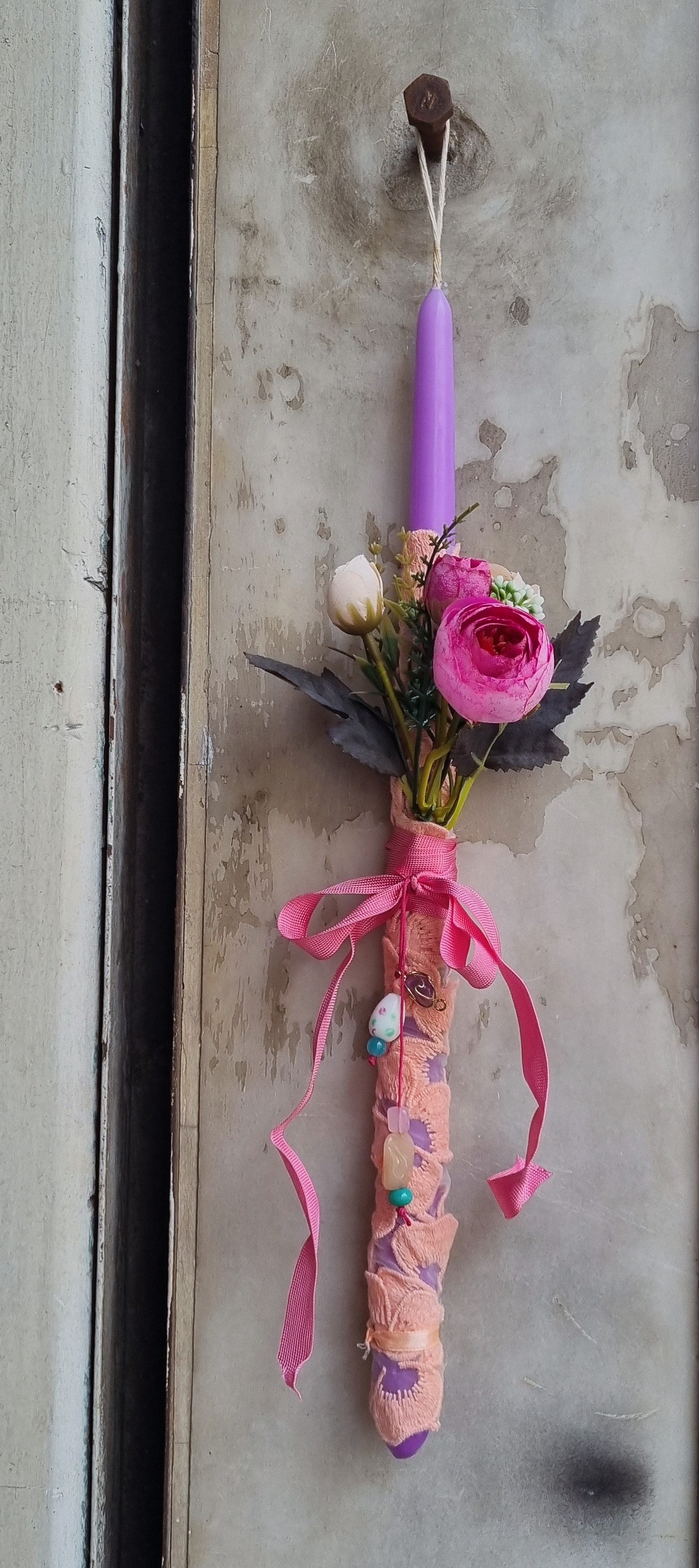 Κλασικό κερί λαμπάδας σε μωβ χρώμα, λουλούδια και πέτρες σε σχοινιά.