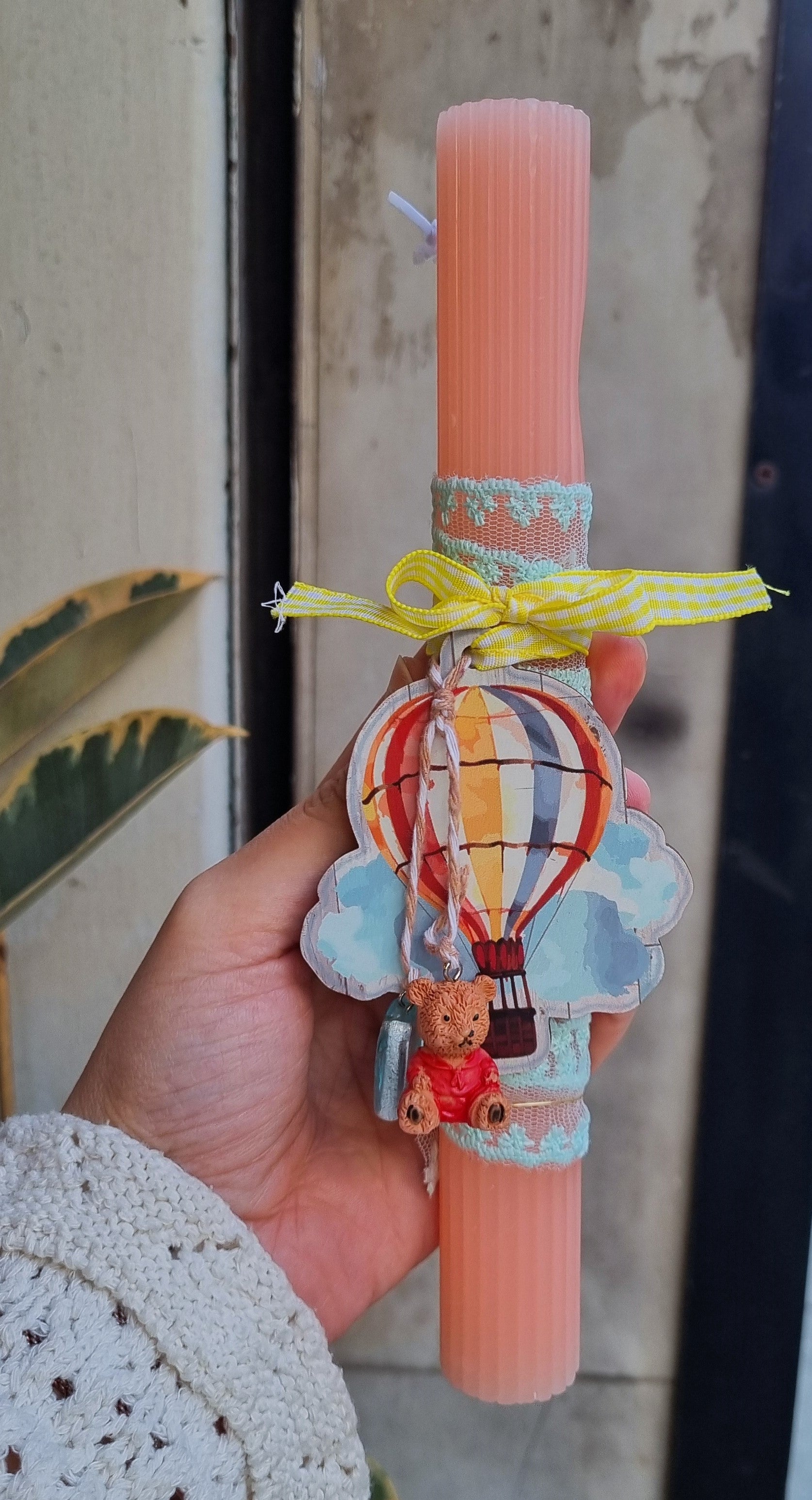 Λαμπάδα από αρωματικό κερί, ξύλινο στοιχείο και αρκουδάκι.