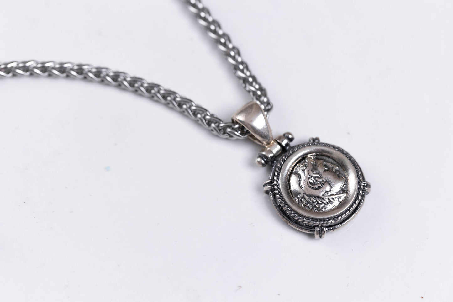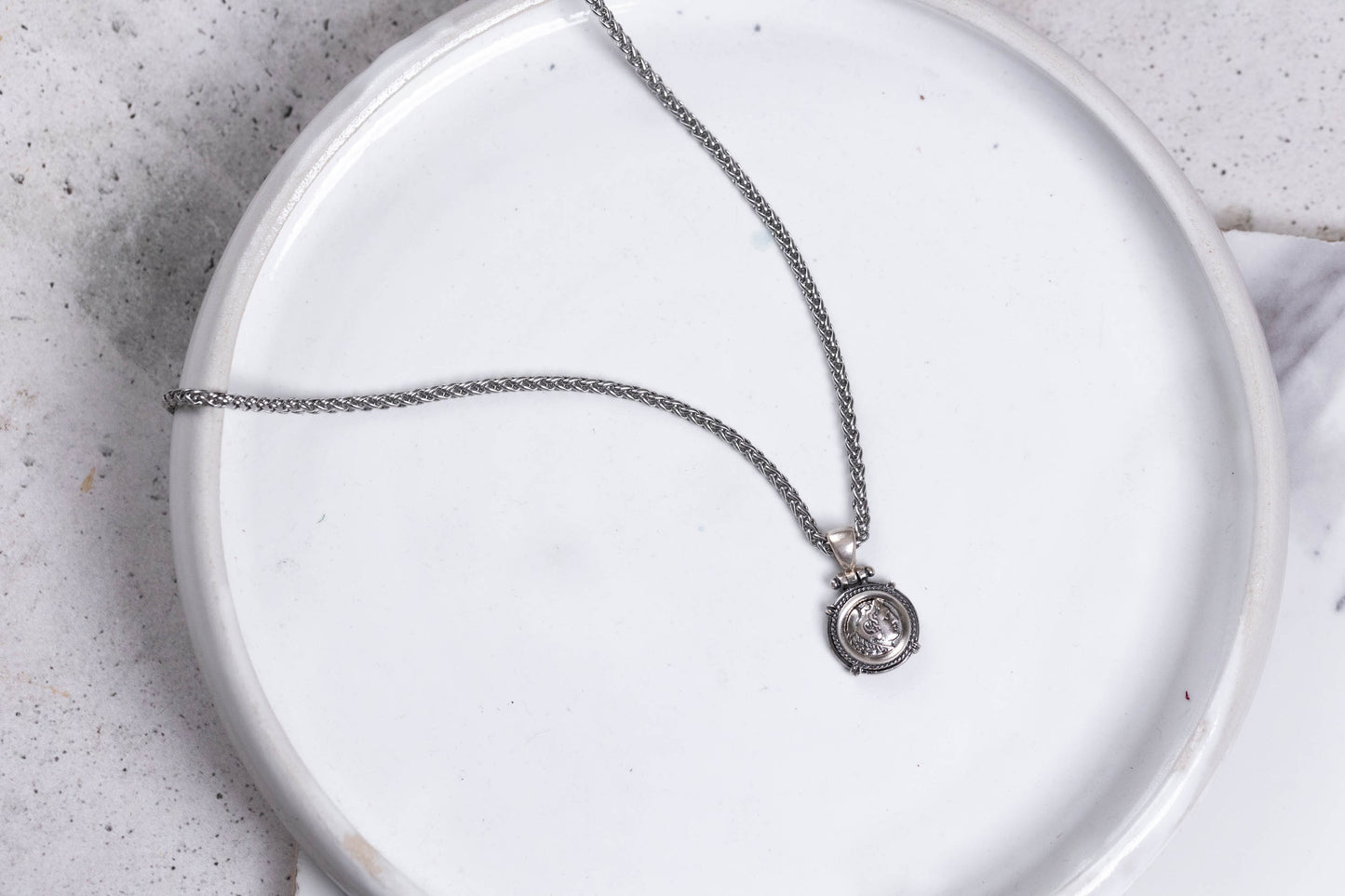 Handmade neckalce of silver 925 with engraving Alexander the Great on surface. This statement pendant is bold but classy. The rope silver stainless steel chain has 4mm width, its waterproof & hypoallergenic.