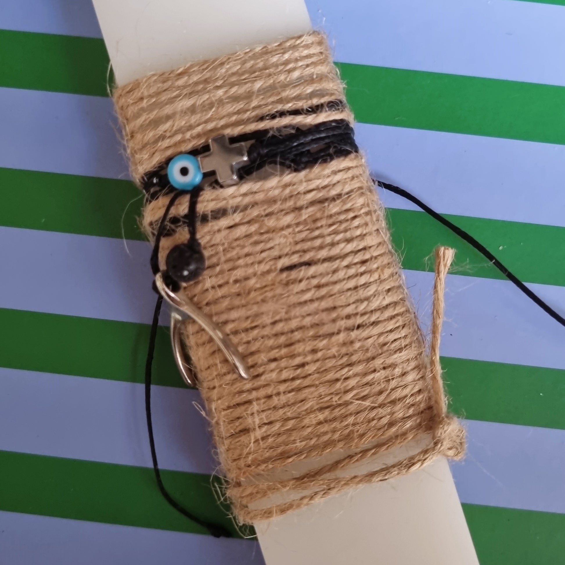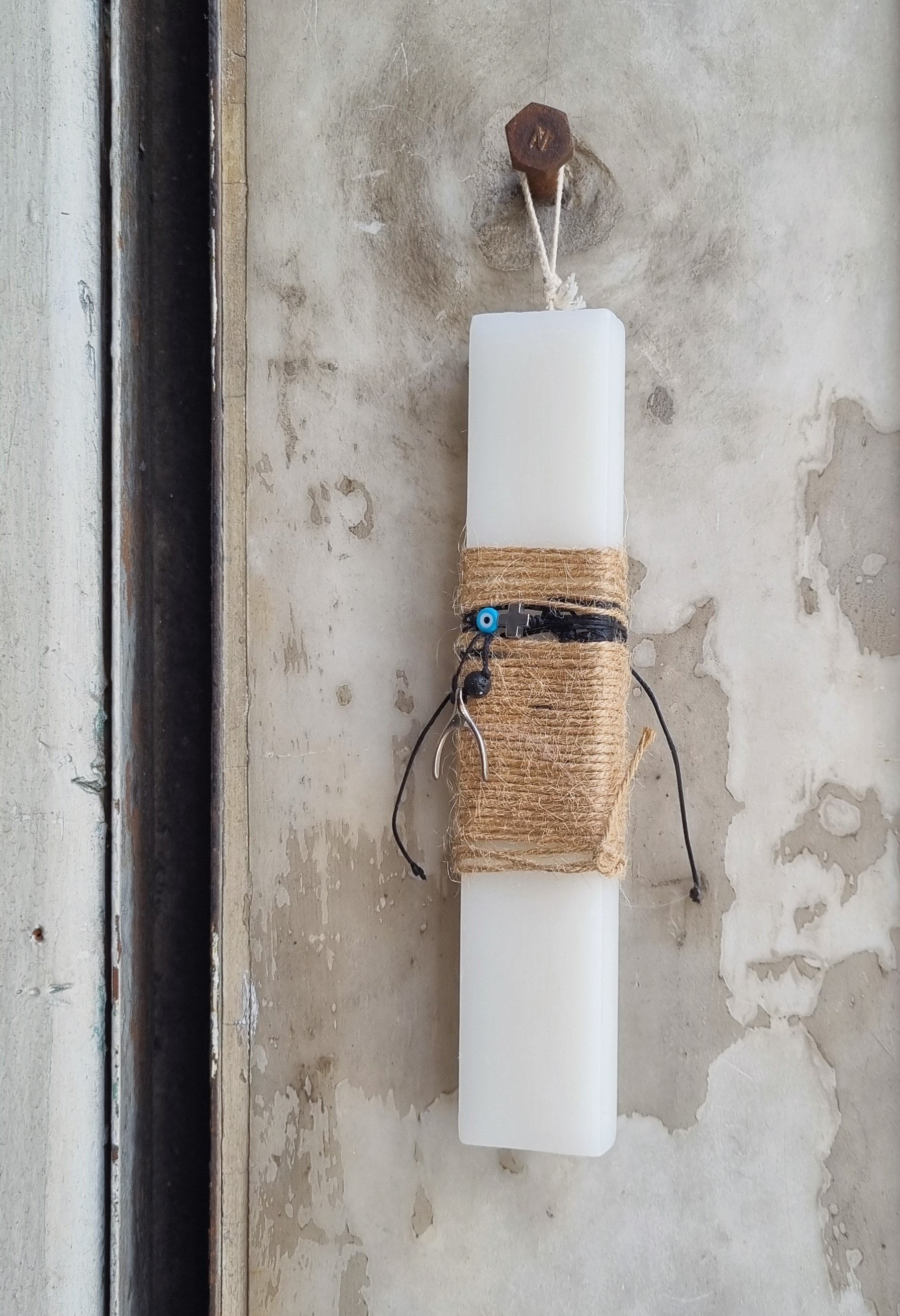 Λαμπάδα από αρωματικό κερί με βραχιόλι με σταυρό αιματίτη και ματάκι & κολιέ με φυλαχτό-πέταλο.