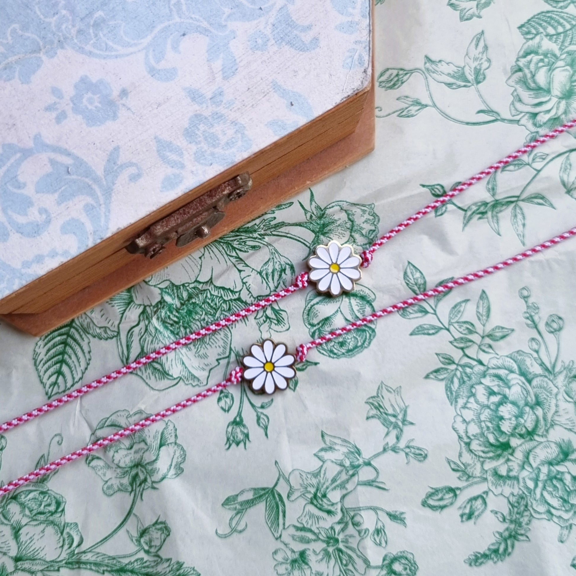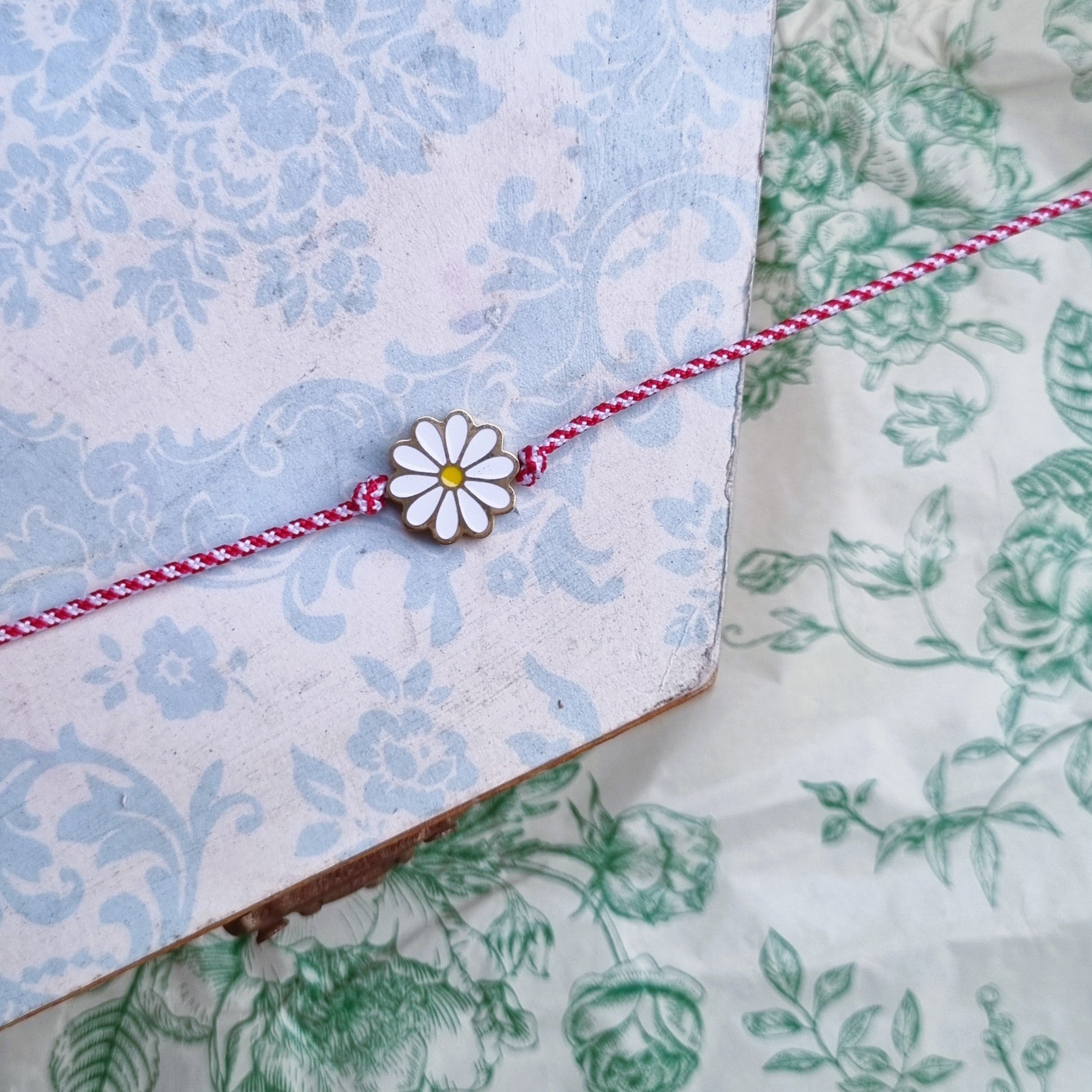 Χειροποίητο μαρτάκι με σχοινί στο χαρακτηριστικό άσπρο και κόκκινο χρώμα. Η μαργαρίτα είναι από ατσάλι ζωγραφισμένη με σμάλτο (αδιάβροχη). Το μέγεθος προσαρμόζεται: μπορείτε να το μικράνετε ή να το μεγαλώσετε όσο θέλετε.