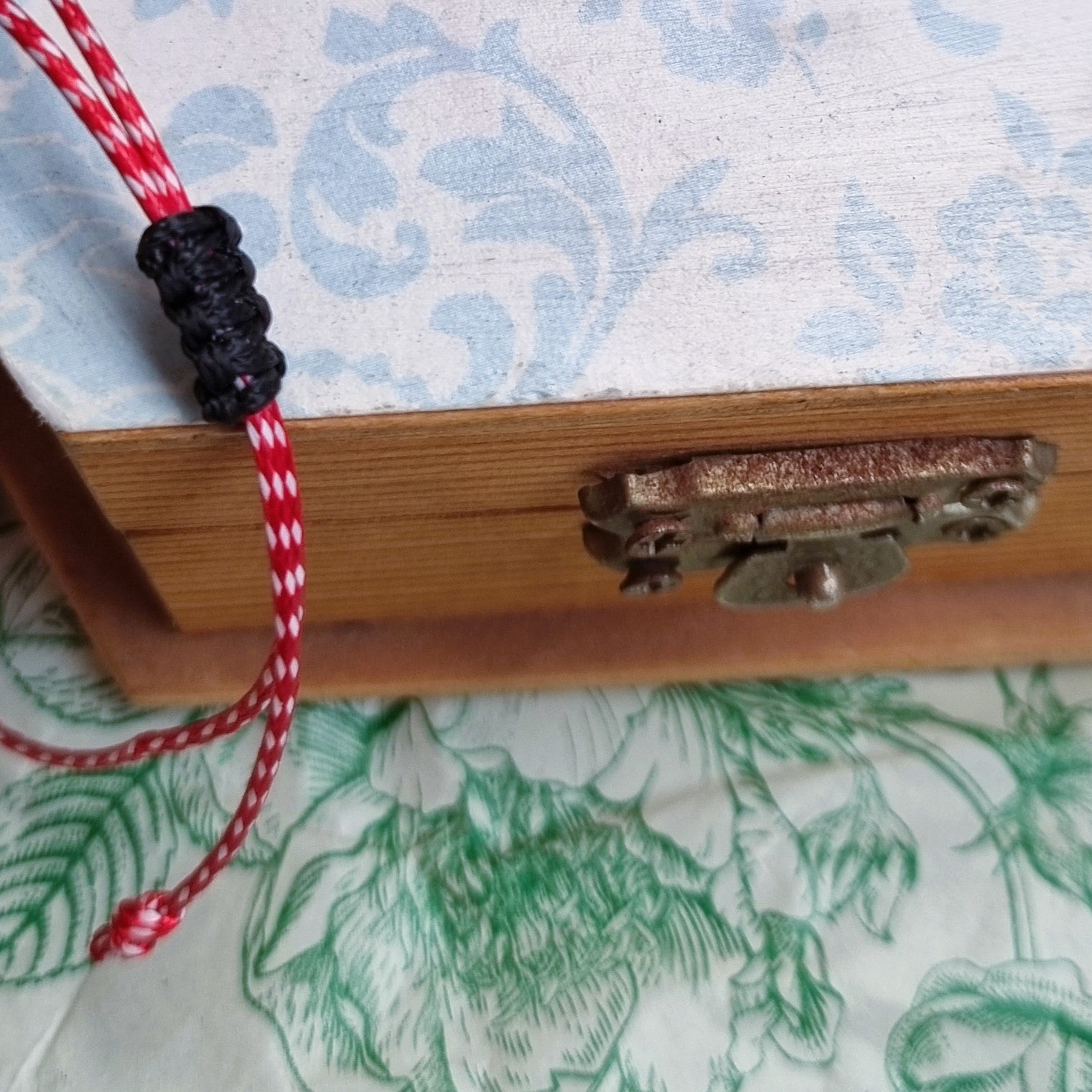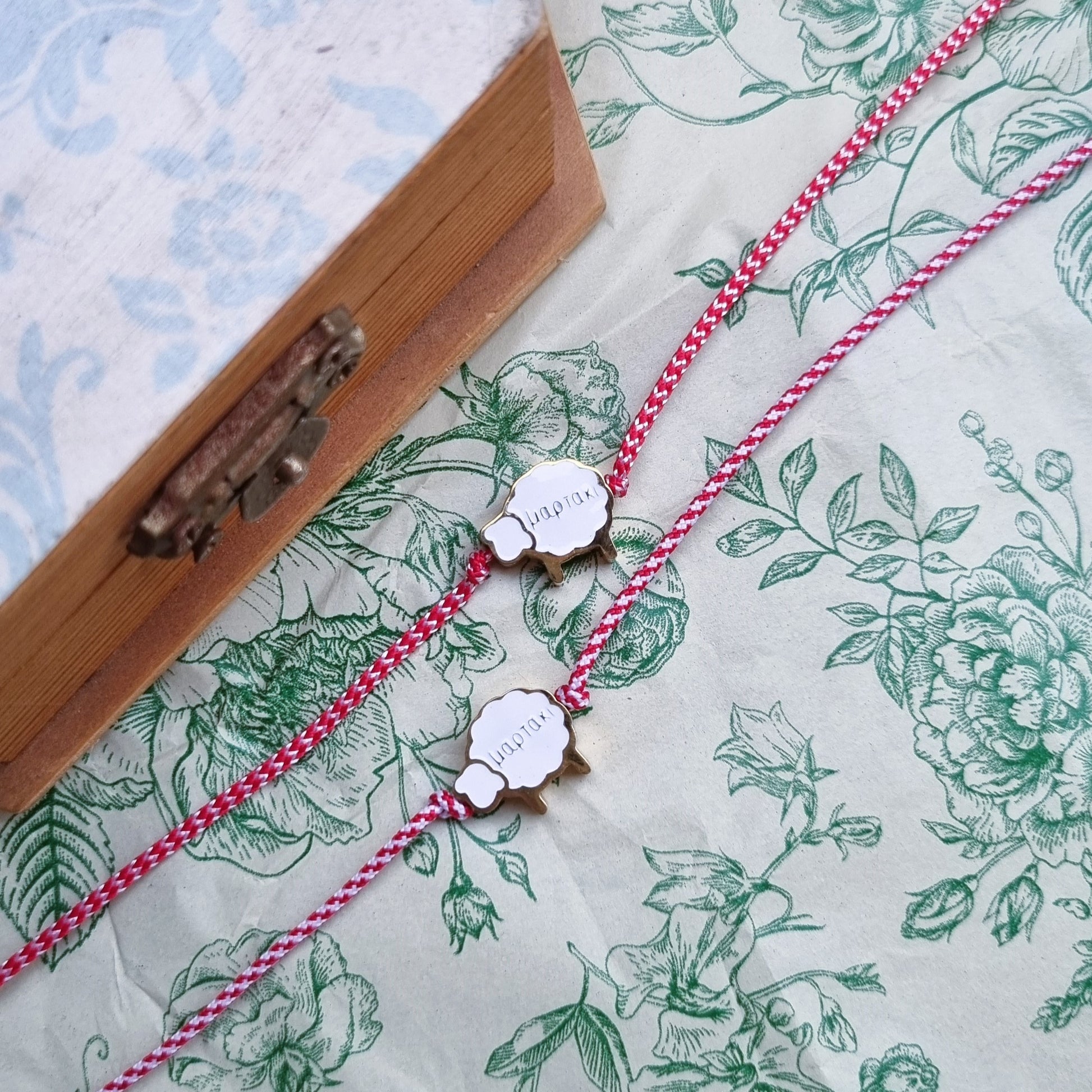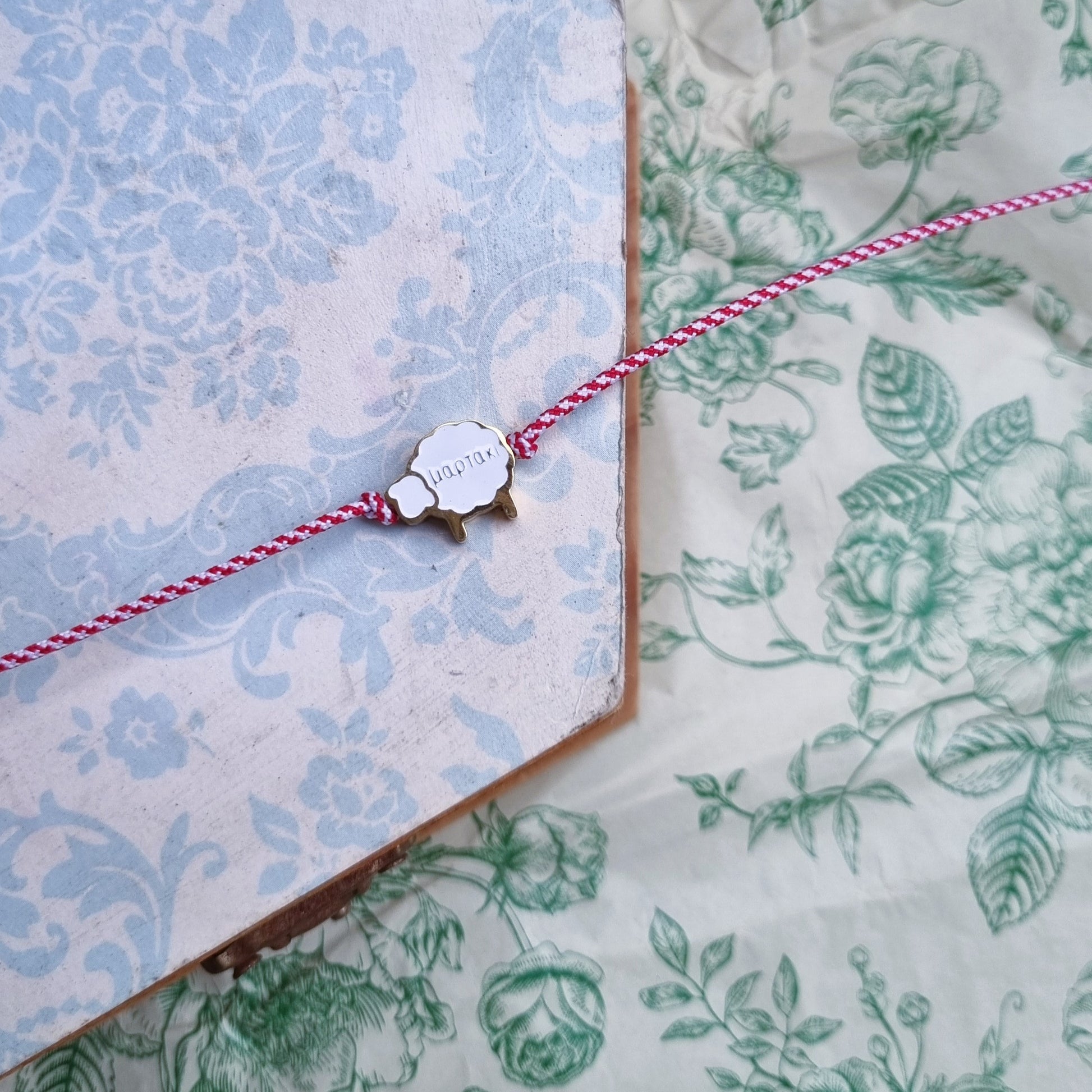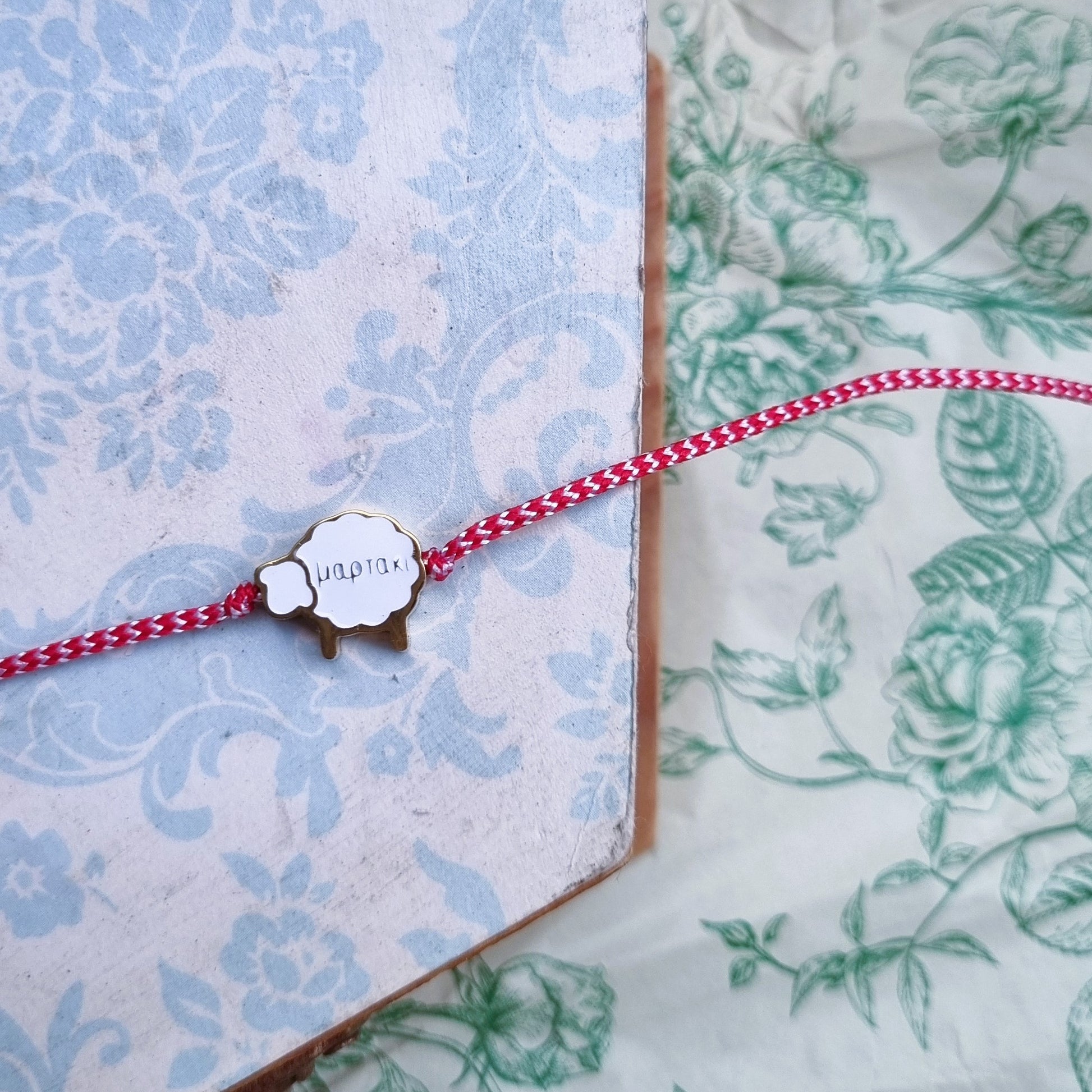 Χειροποίητο μαρτάκι με κορδόνι σε κόκκινο και λευκό χρώμα και ατσάλινο στοιχείο-προβατάκι. Το στοιχείο είναι αδιάβροχο.