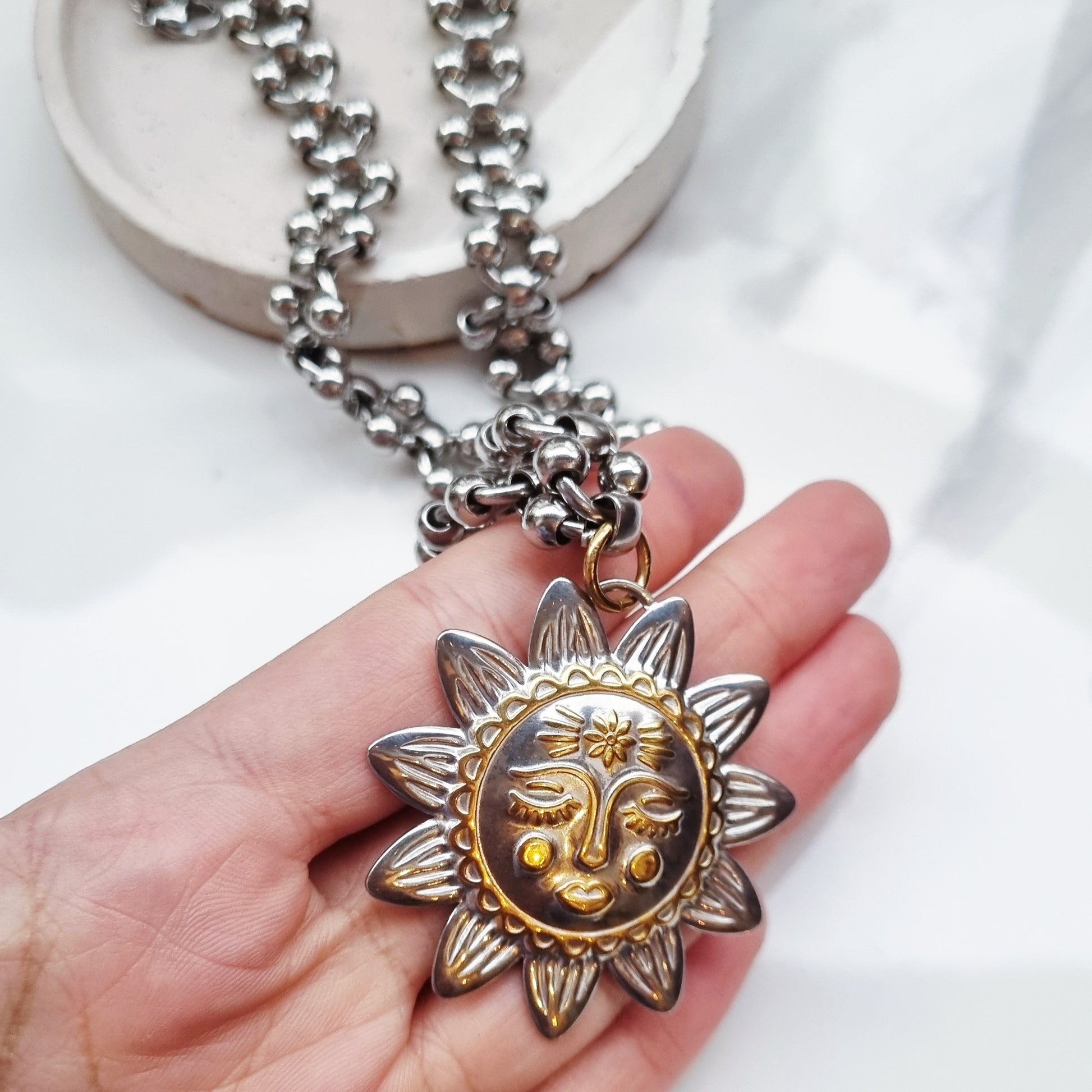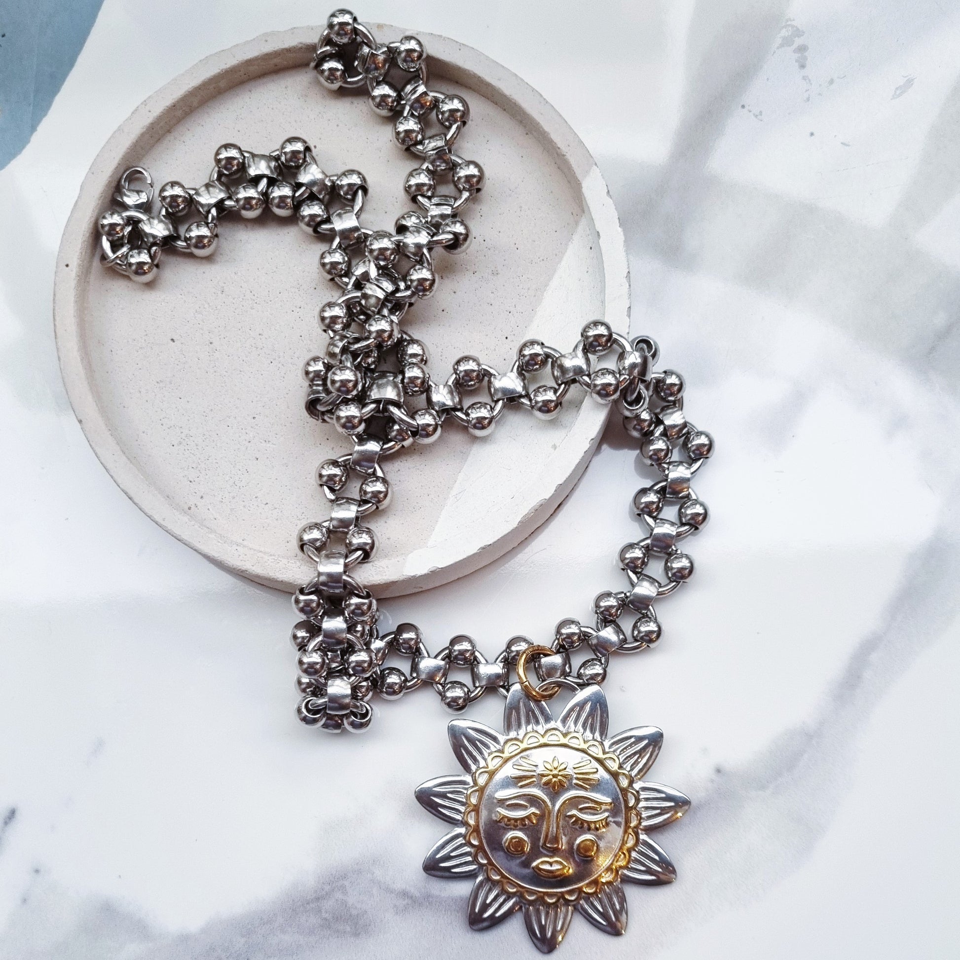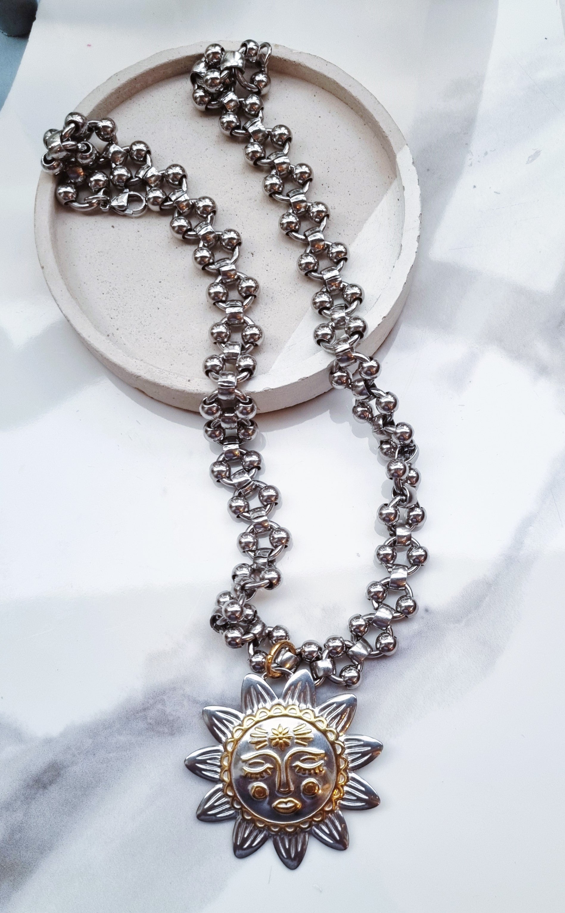 - a big gold stainless steel two tones sun charm (4.8cm) on our statement st.steel chain
