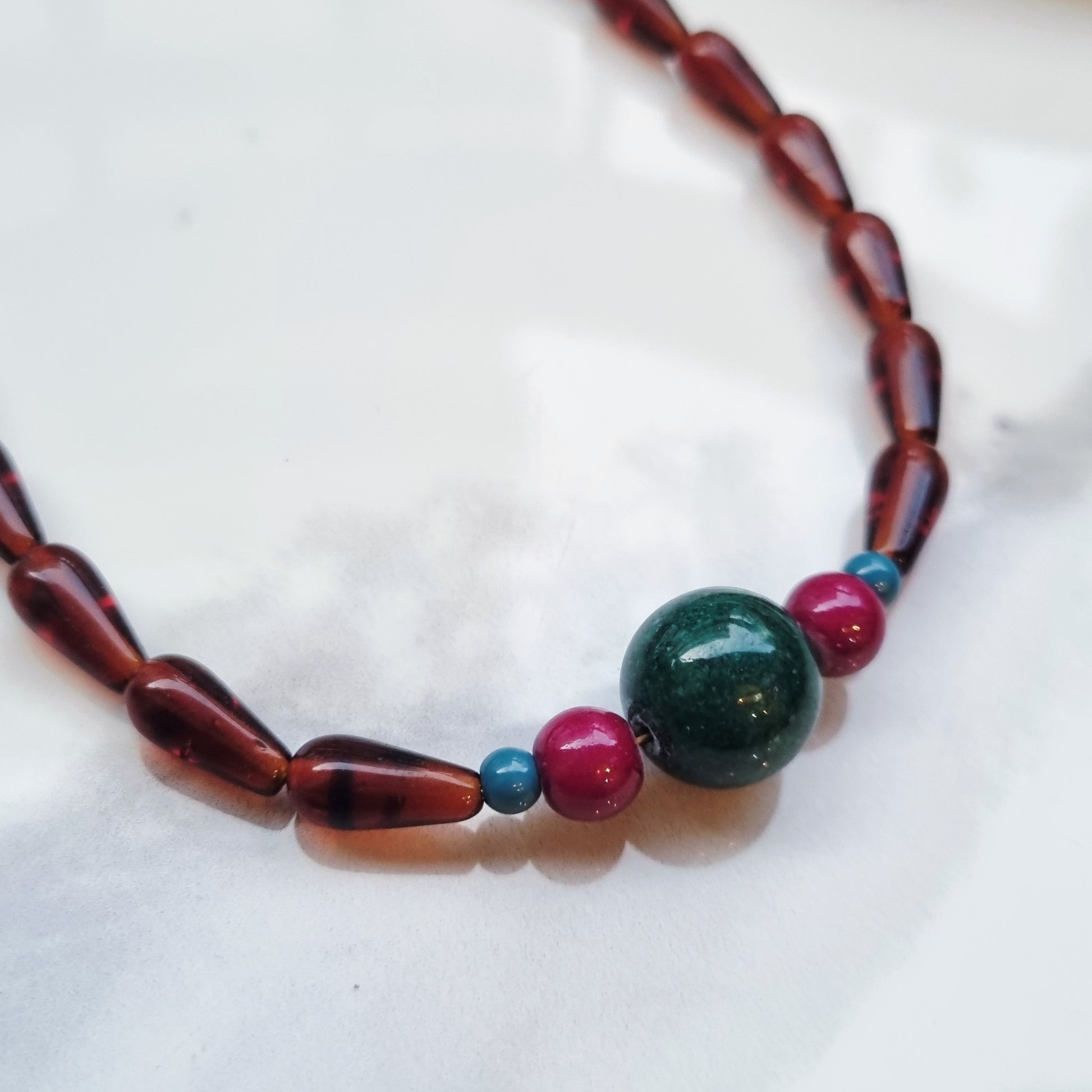 - brown beads in drop shape, a 12mm green jade stone and glass beads
