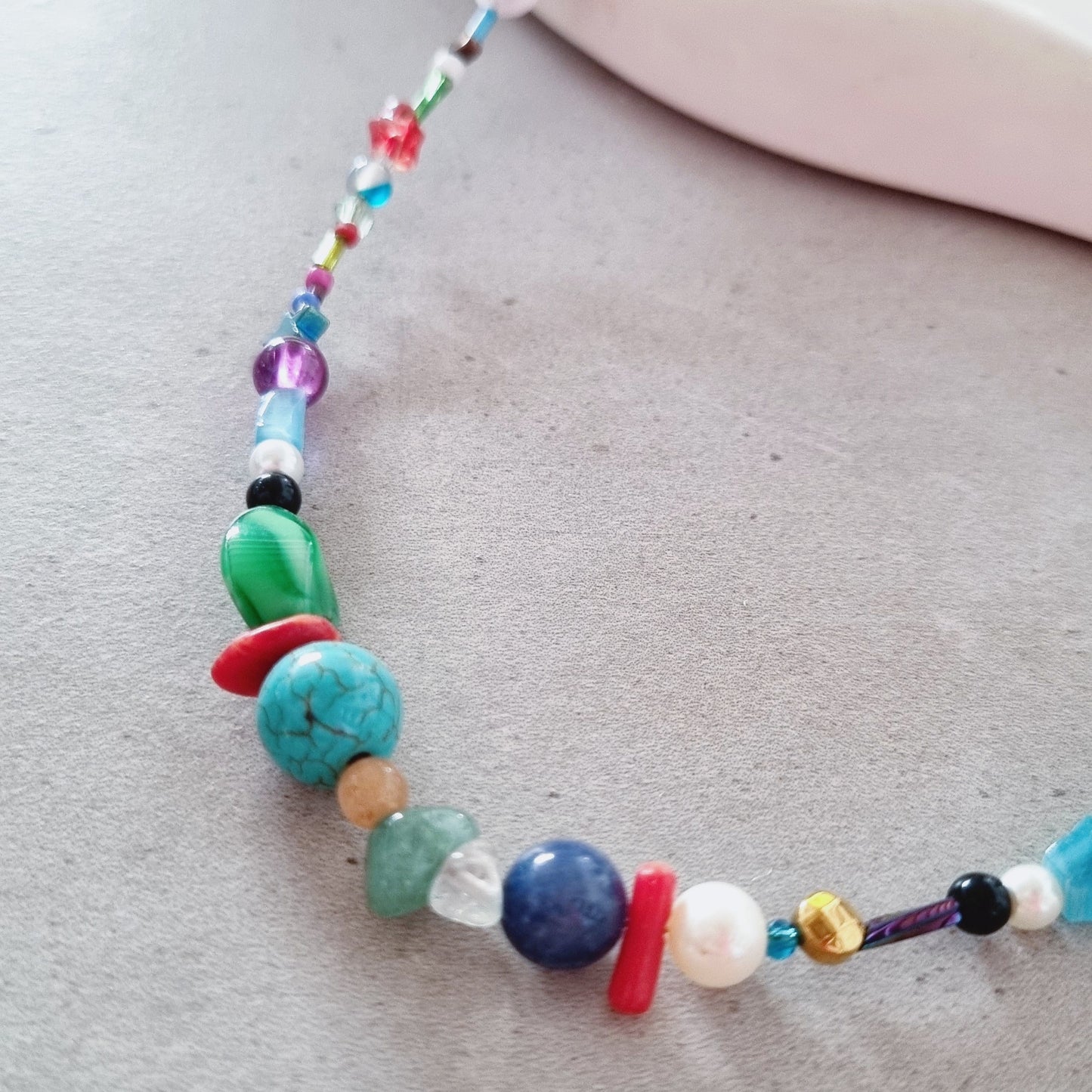 A handmade necklace full of colors. Made of precious/semiprecious stones as agate, amethyst, pearls, jade, hematie, moonstone, amazonites, aventurine.