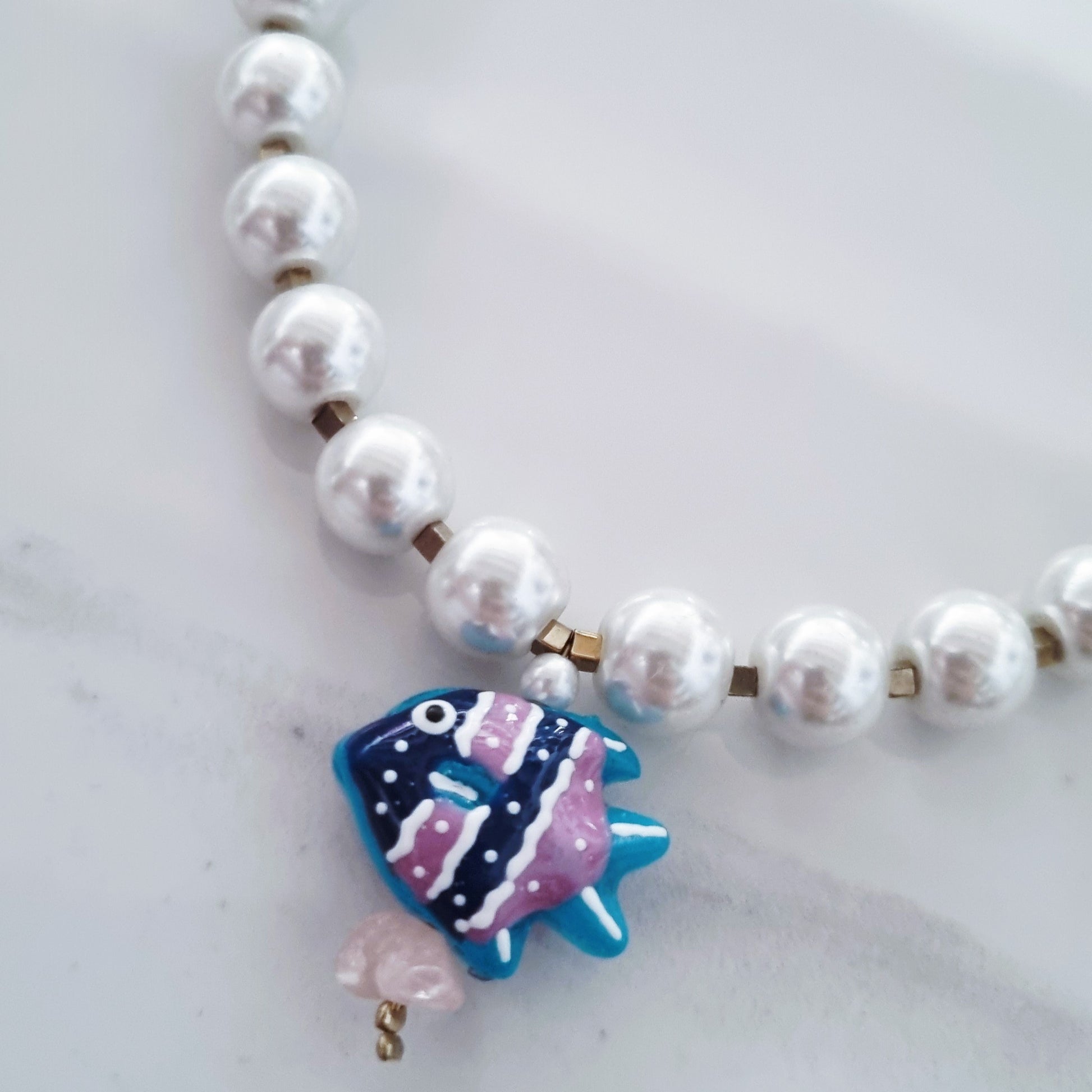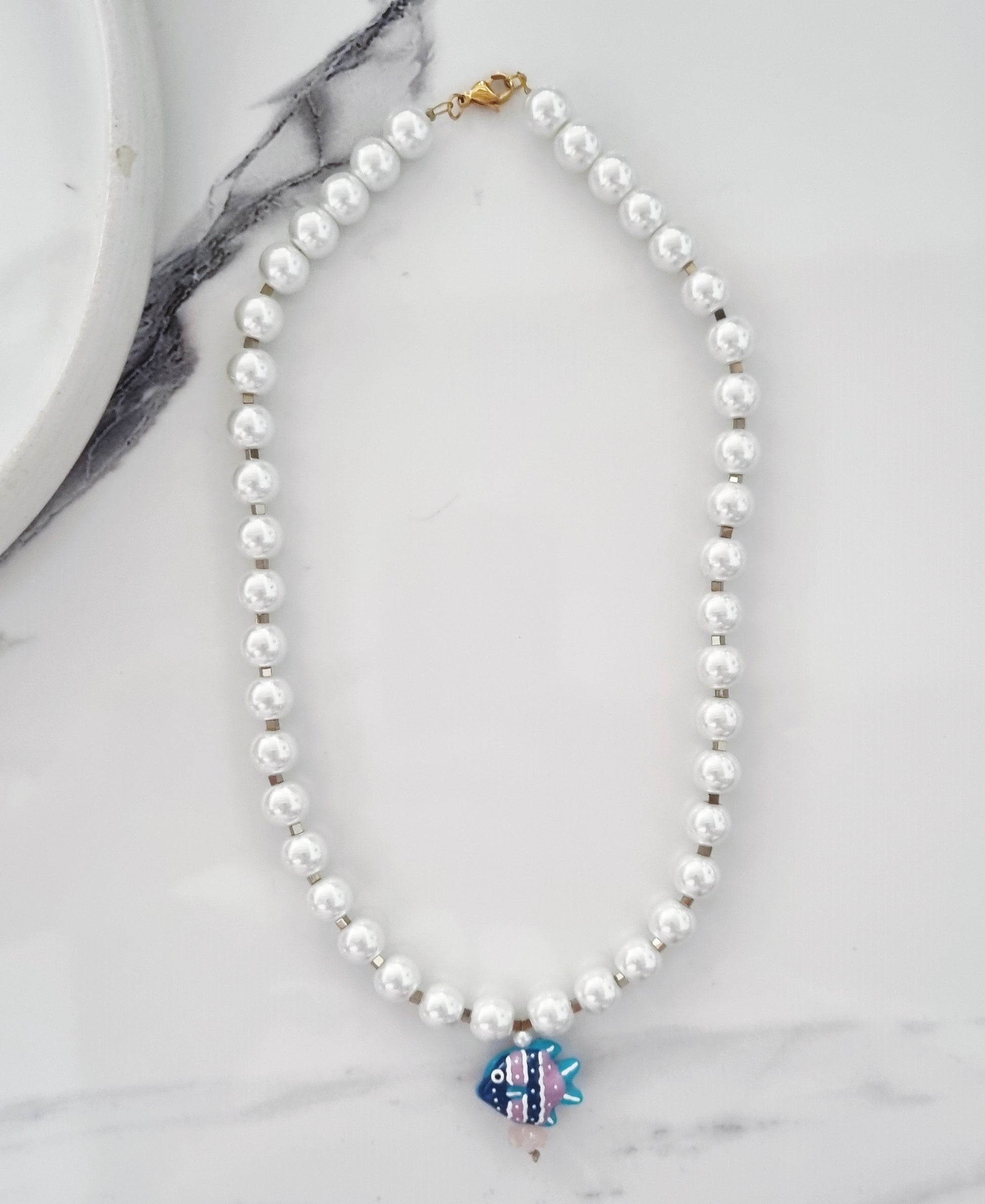 - 8mm white glass pearls, acrylic painted fish, gold hematite cubes