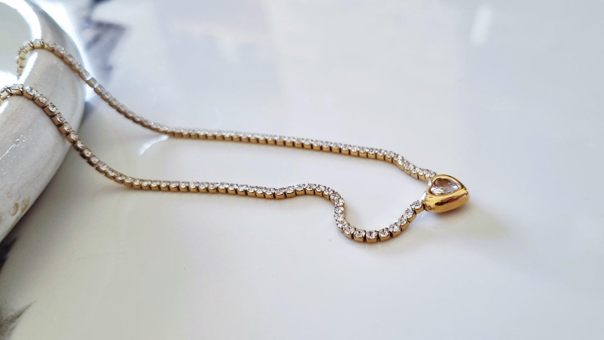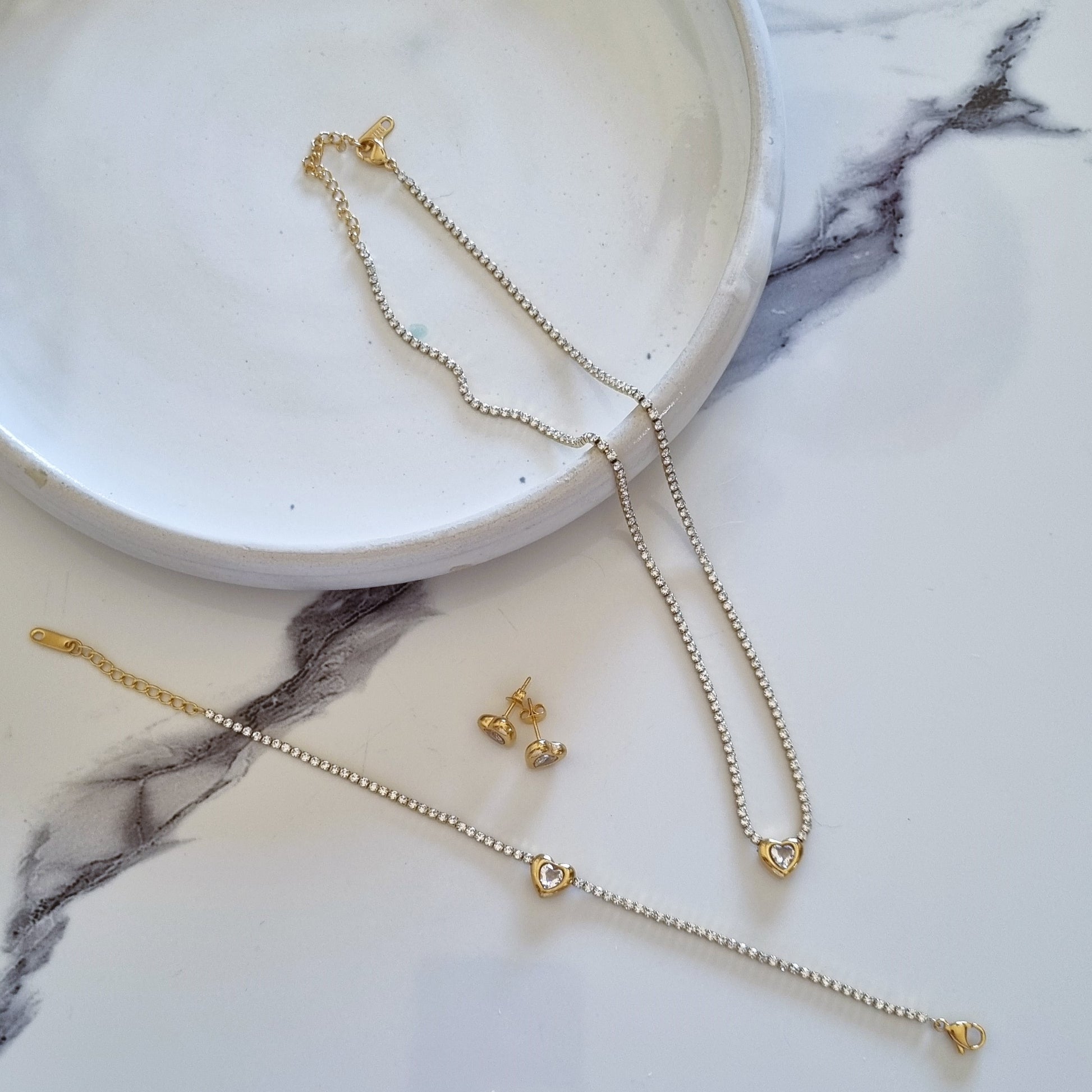 The Shape of Love Set features a beautifully coordinated necklace, earrings, and bracelet crafted from durable gold stainless steel. Each piece showcases heart-shaped designs adorned with clear zirconia stones, offering a refined sparkle that enhances any outfit. This elegant set combines lasting quality with timeless style, making it a sophisticated choice for those who appreciate both craftsmanship and subtle glamour.