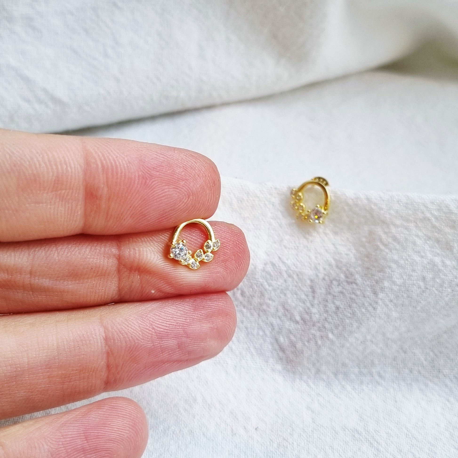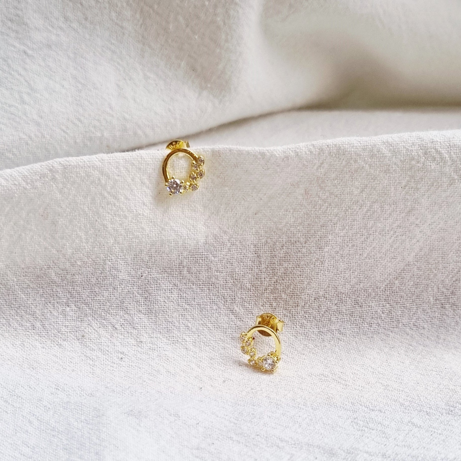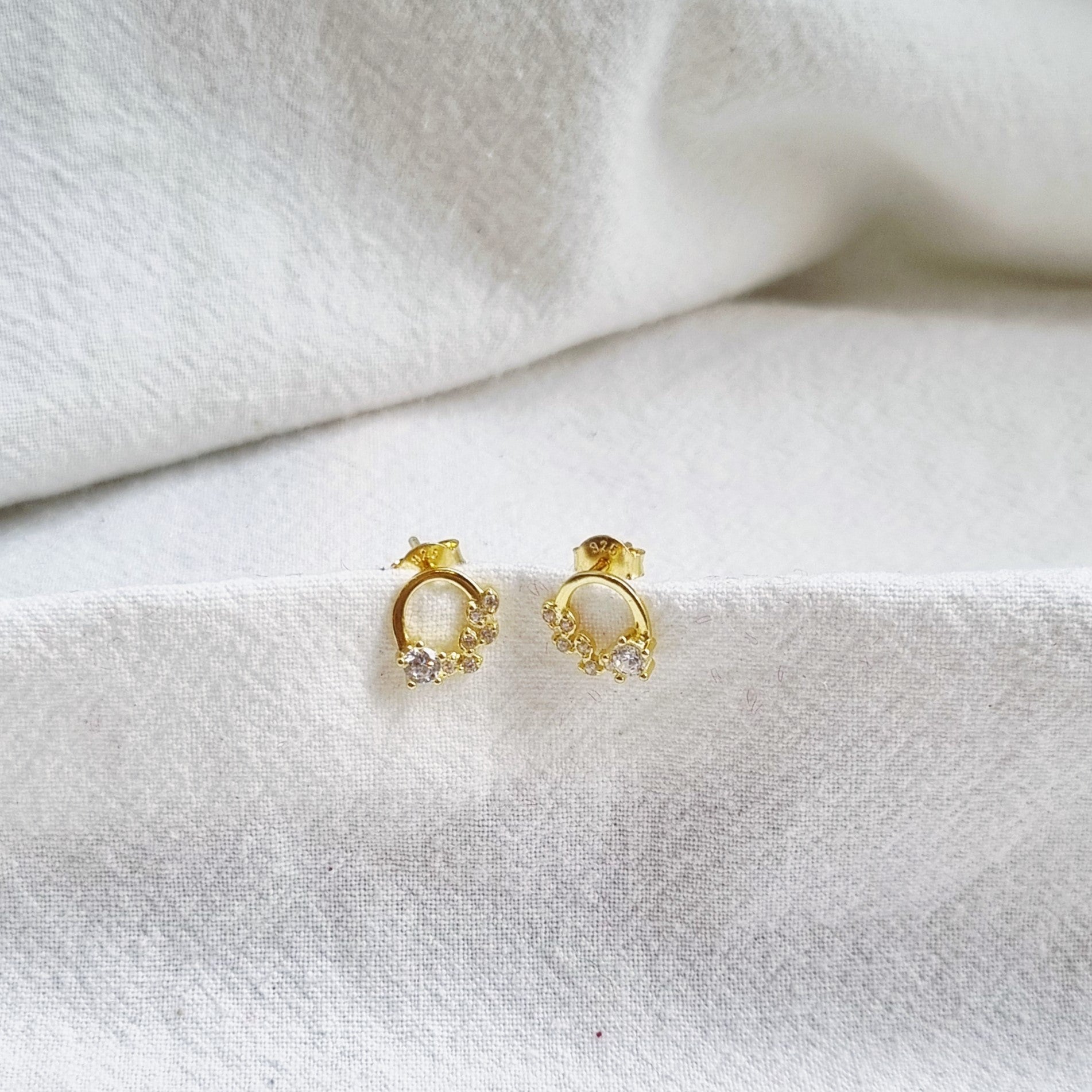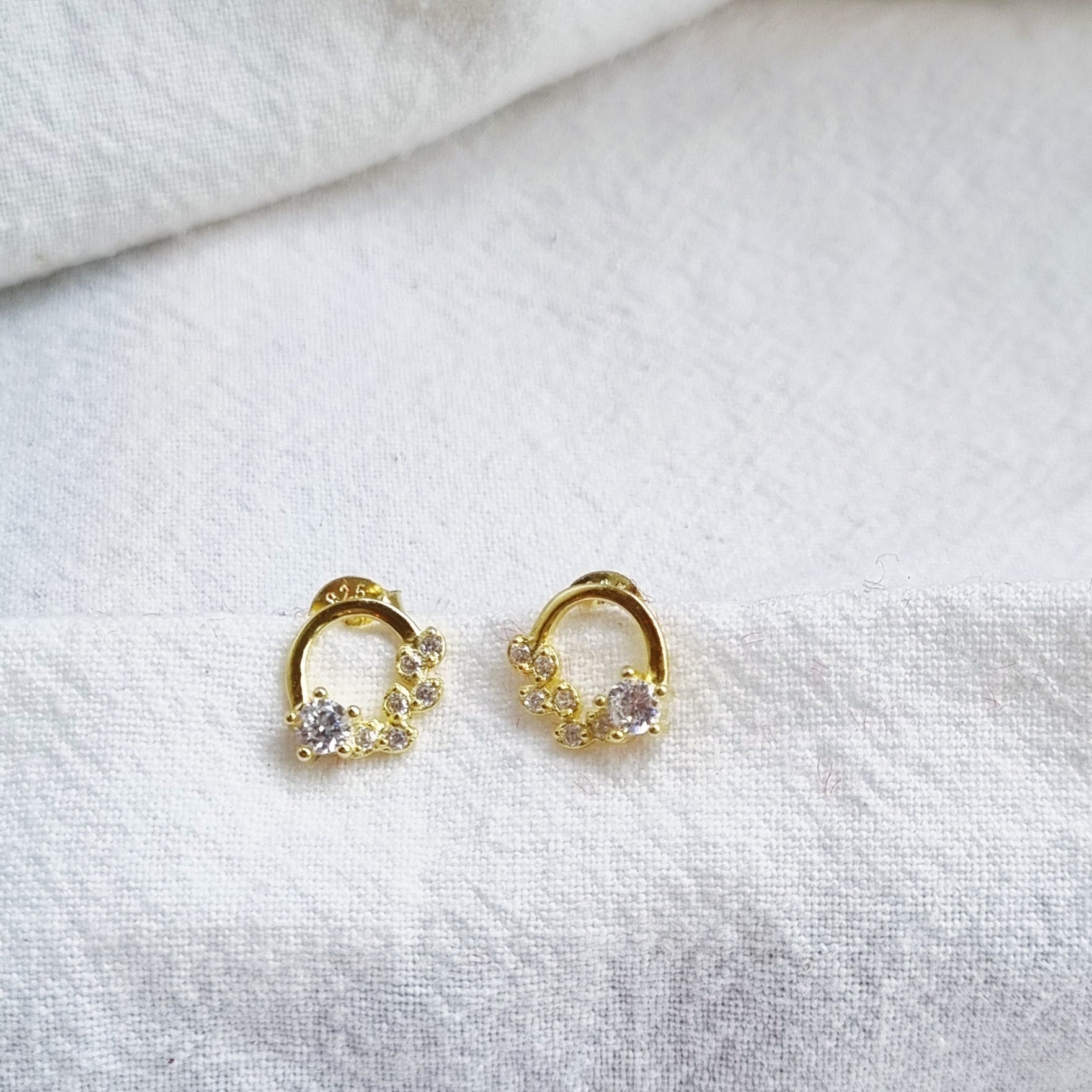 Elegant circular stud earrings crafted with gold-plated silver and adorned with sparkling cubic zirconia stones. These lightweight pieces deliver timeless sophistication for any occasion, whether worn daily or for special events. The brilliant crystal details catch the light beautifully, creating a radiant finish that complements any style.