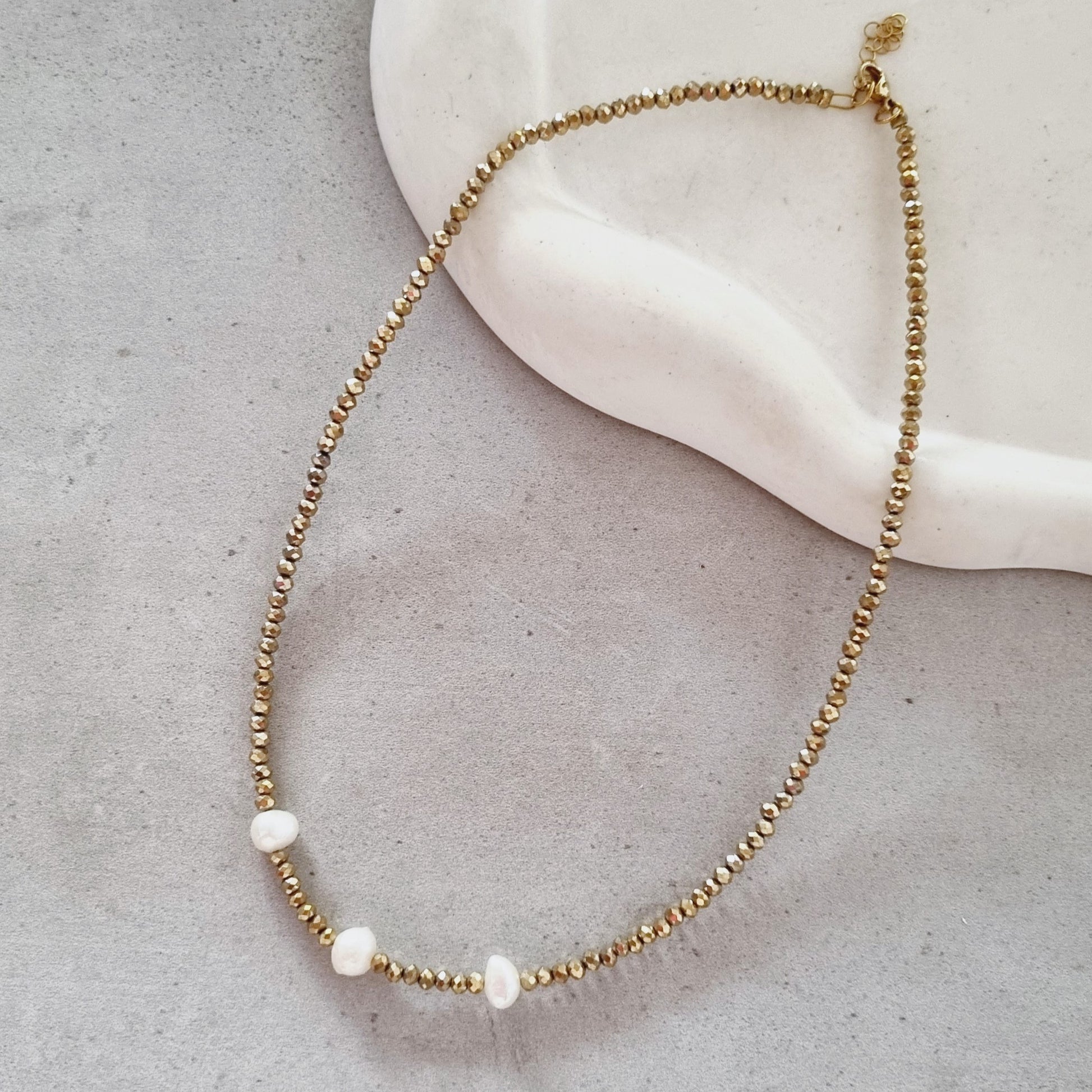 Χειροποίητο κολιέ με χρυσά κρυσταλλάκια και μαργαριτάρια.
